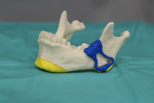 הדמיה של מיקום הג'יג (בכחול) על גביי המודל התלת מימדי. בצהוב - חתיכות העצם המיועדות להוצאה בניתוח.