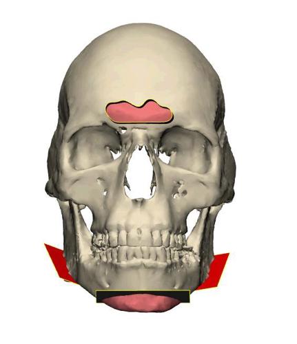 הדמיה ממוחשבת של התכנון הכירורגי השלם: חיתוך של זוויות הלסת התחתונה, חידוד הסנטר והשטחת המצח