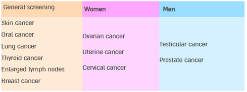 Regardless of whether cancer is caused by genetic inheritance, biological changes, lifestyle, environmental influences, or the combination of several of these factors, early disease detection can reduce mortality by up to 90%, increase treatment effectiveness, and improve the quality of life for cancer patients. The objective of screening is to provide a guide for essential cancer detection and to detail individualized prevention methods and/or early testing regimens.