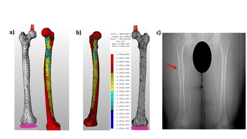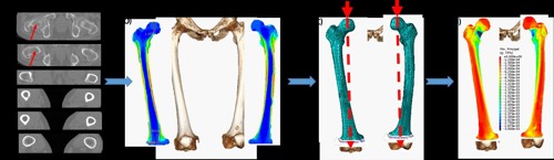איור 1. הדמיית CT משמאל עם חתכים אקסיאלים של עצמות הירך (a) משוחזרת למבנה תלת מימד של עצמות הירך. לידה, הדמיה של חלוקת העומסים בעצמות (b). סימולצית העמסה ממוחשבת מדמה הליכה (c) והתוצאה המתקבלת במפת עומסים של לחיצה בשתי עצמות הירך (d).