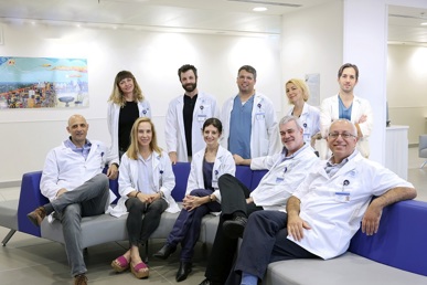 עומדים: ד"ר דניאל קידר, רופא בכיר במחלקה לכירורגיה פלסטית, גב' מריאן מייבסקי, אחות מתאמת גידולי מוח, ד"ר ערן נזרי, מנהל מחלקה כירורגית ב' ומנהל יחידת ניתוחי חלל הצפק ומלנומה בחטיבה הכירורגית, ד"ר יהונתן בר, רופא בכיר במערך לרפואת עור, גב' רוזלין פורר, אחות מתאמת גידולי מלנומה בחטיבה הכירורגית
